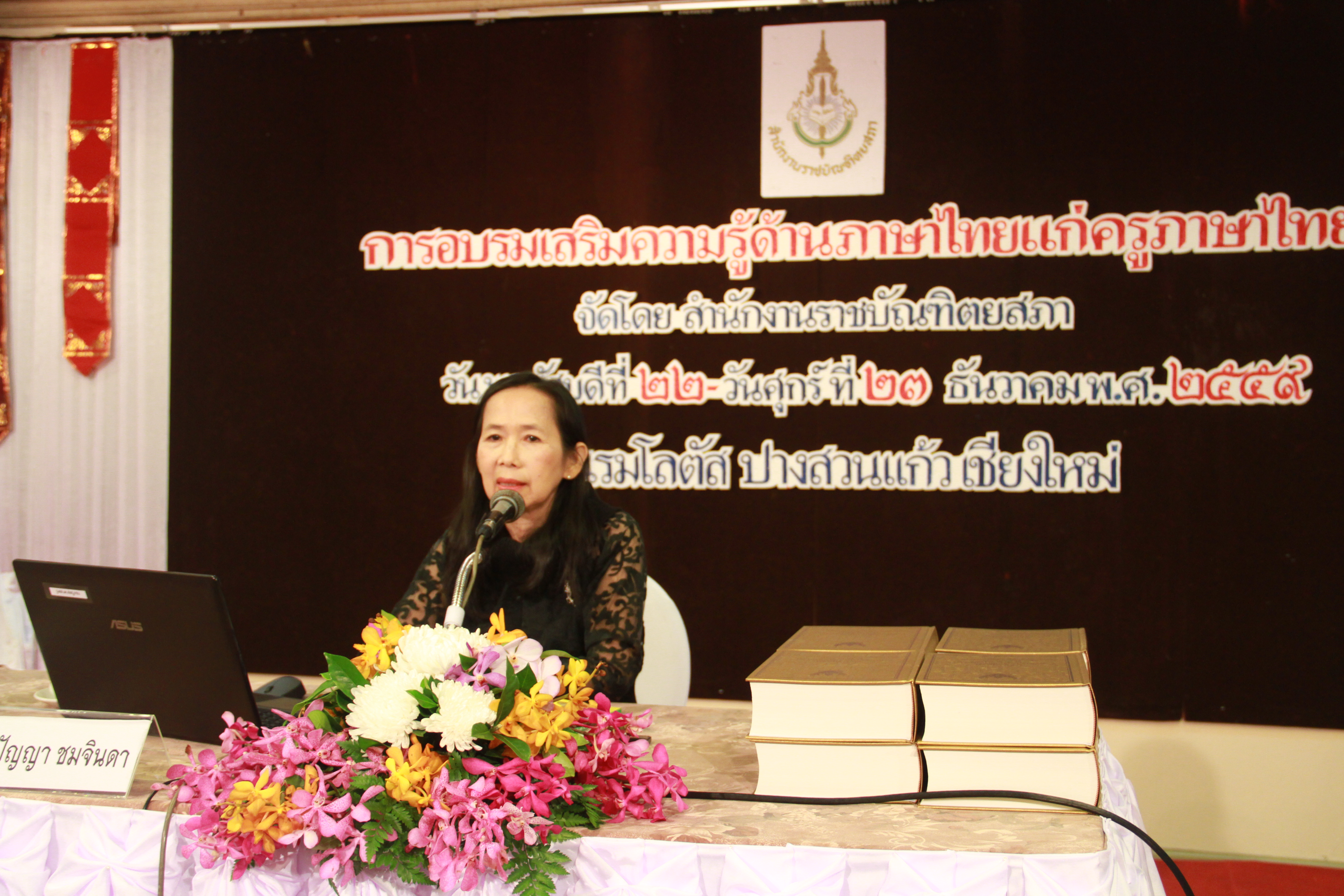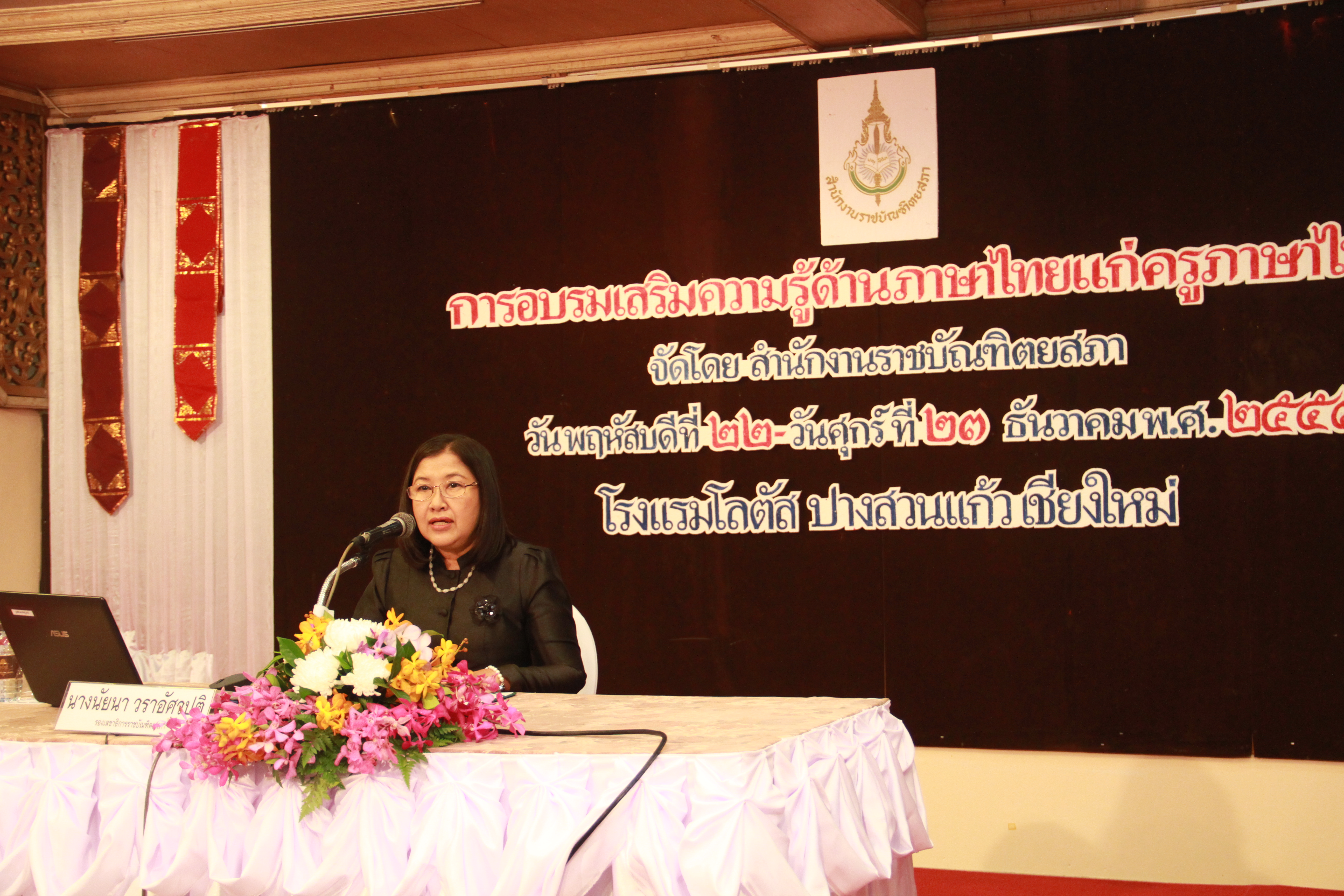 เมื่อวันที่ ๒๒ ธันวาคม พ.ศ. ๒๕๕๙ เวลา ๙.๐๐ น. นางนัยนา วราอัศวปติ รองเลขาธิการราชบัณฑิตยสภา เป็นประธานเปิดการอบรมเสริมความรู้ด้านภาษาไทยแก่ครูภาษาไทย : ภาคเหนือ ซึ่งเป็นโครงการที่สำนักงานราชบัณฑิตยสภาจัดขึ้นเพื่อเสริมความรู้ แนวคิด และมุมมองทางด้านภาษาไทยแก่ครูอาจารย์ผู้สอนภาษาไทยให้มีความรู้ความสามารถเกี่ยวกับภาษาไทยและการใช้ภาษาไทยที่ถูกต้องเหมาะสม รวมทั้งให้ครูอาจารย์ภาษาไทยที่เข้ารับการอบรมฯ สามารถนำไปประยุกต์ใช้ในการสอนได้ ทั้งนี้ การอบรมฯ ครั้งนี้ จัดขึ้นระหว่างวันที่ ๒๒-๒๓ ธันวาคม พ.ศ. ๒๕๕๙ ณ ห้องสันพระเนตร โรงแรมโลตัส ปางสวนแก้ว จังหวัดเชียงใหม่