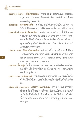 plasticity สภาพพลาสติก สมบัติของดินที่ปั้นหรือคลึงเป็นรูปร่างต่าง ๆ